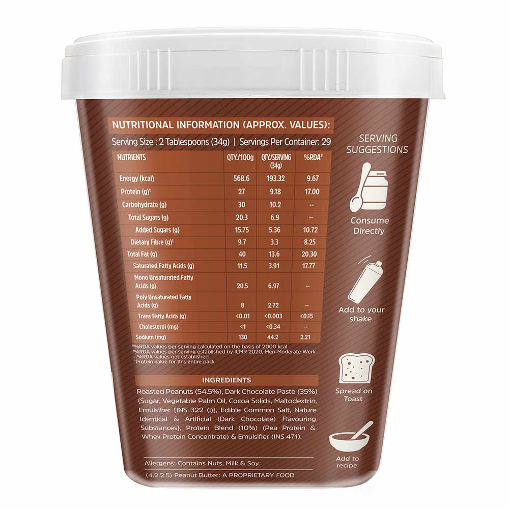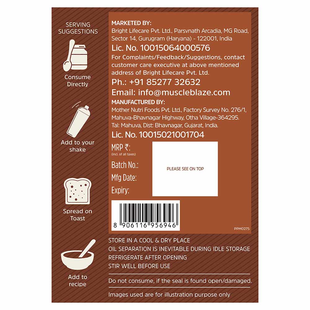 MuscleBlaze MB Protein Peanut Butter is a rich chocolatey experience for all fitness lovers. This rich creamy peanut butter offers you 30g protein to fulfill your everyday protein requirements. This product is enriched with premium quality whey protein concentrate. This exotic blend of rich dark chocolate and healthy peanut butter is perfectly healthy and delicious at the same time as it contains no added preservatives or even salt, just pure peanuts roasted perfectly to leave a rich aroma. This versatile spread can be used to make delicious protein smoothies or shakes or can be spread on your toast. It can also be used in multiple recipes and if you want you can also dig in and have 2 spoonfuls of this chocolatey peanut butter. Forget all the unhealthy spreads!